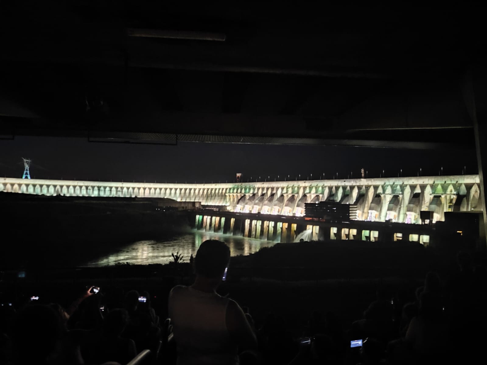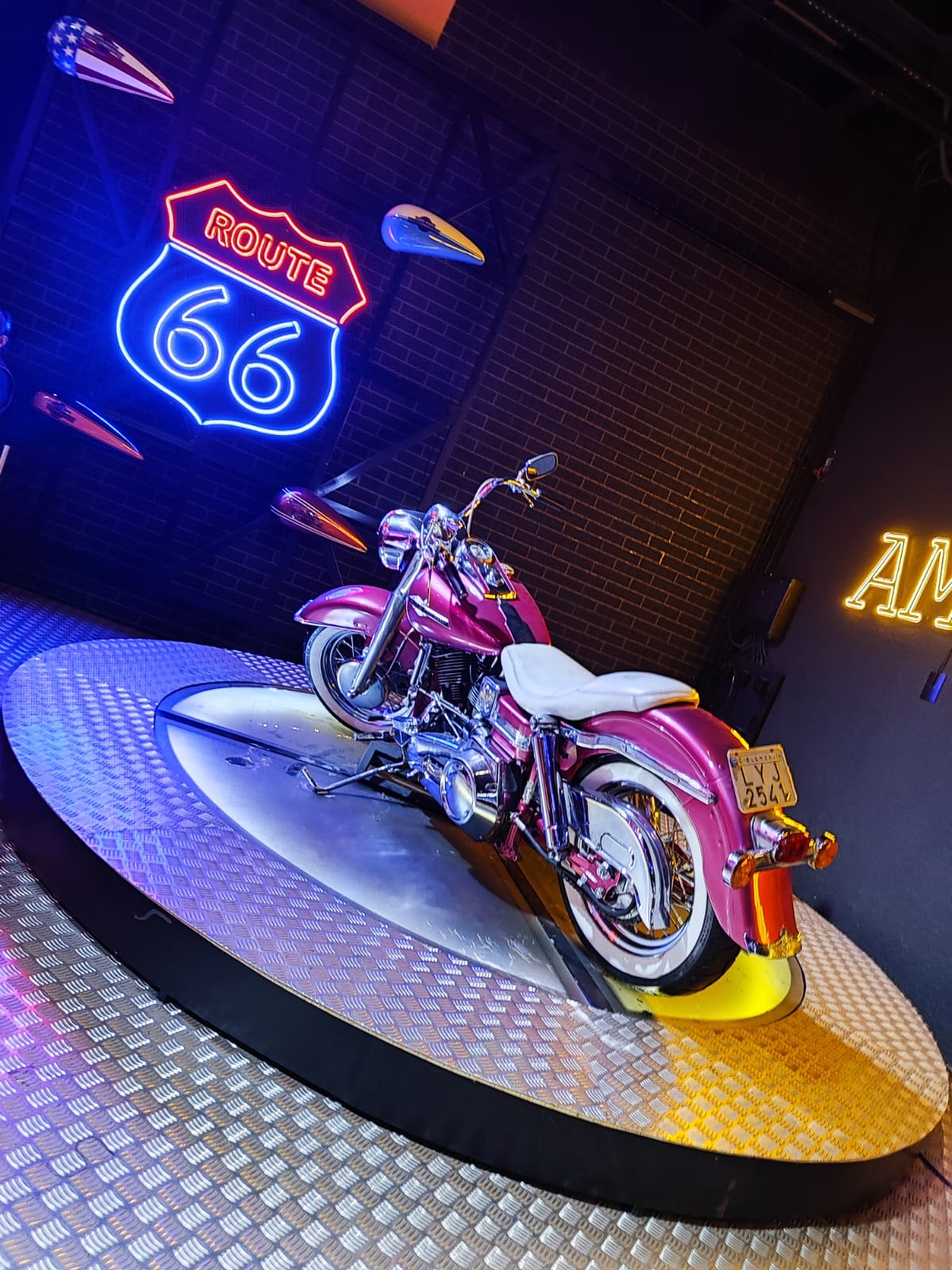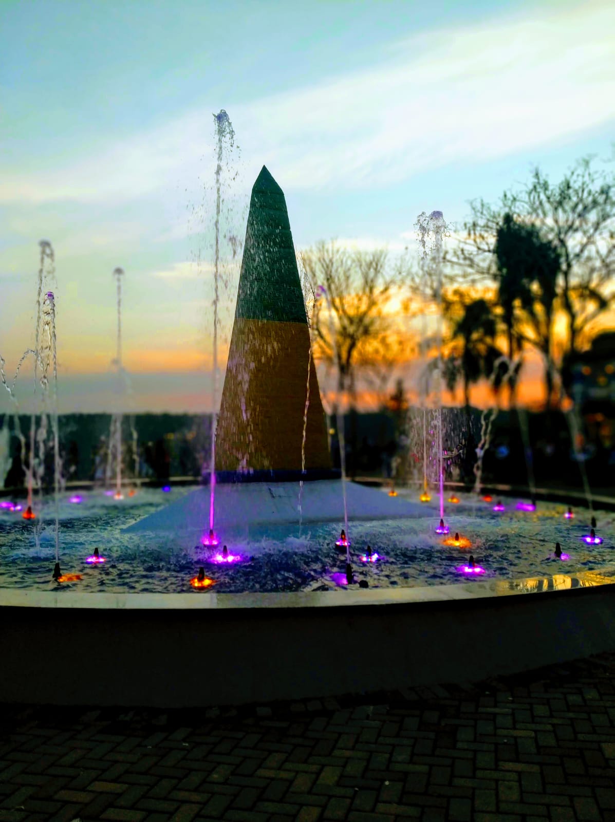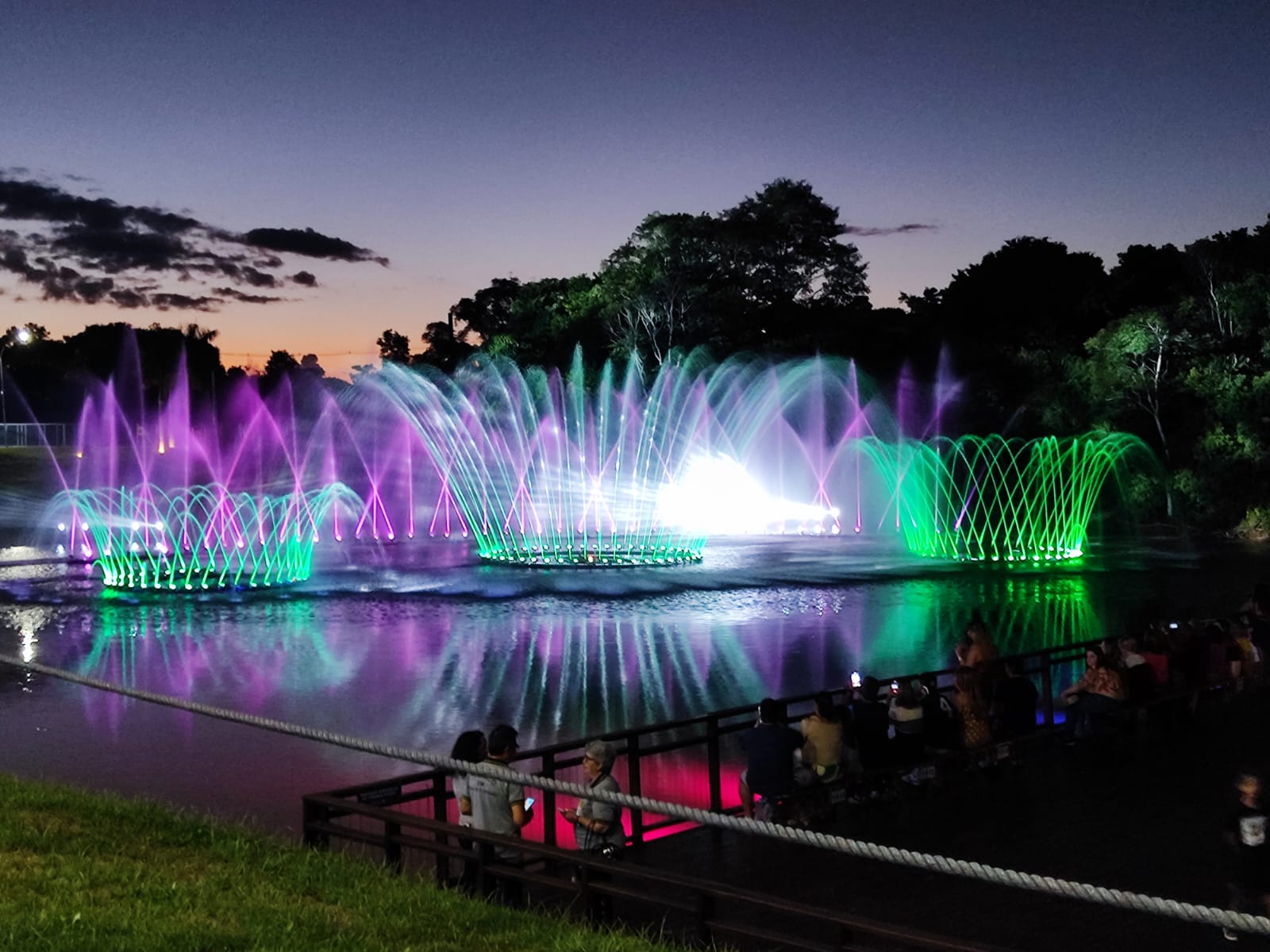 Luzes neon, motos, espetáculos aquáticos e arquitetura ao anoitecer.