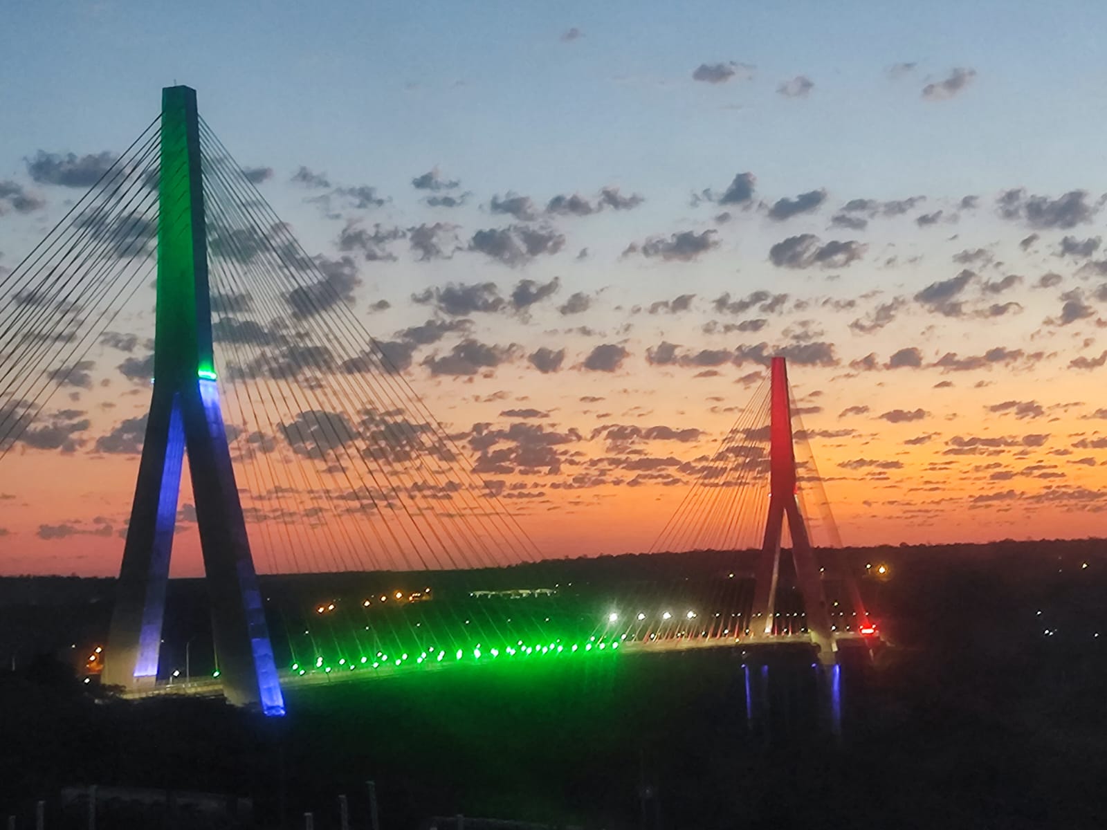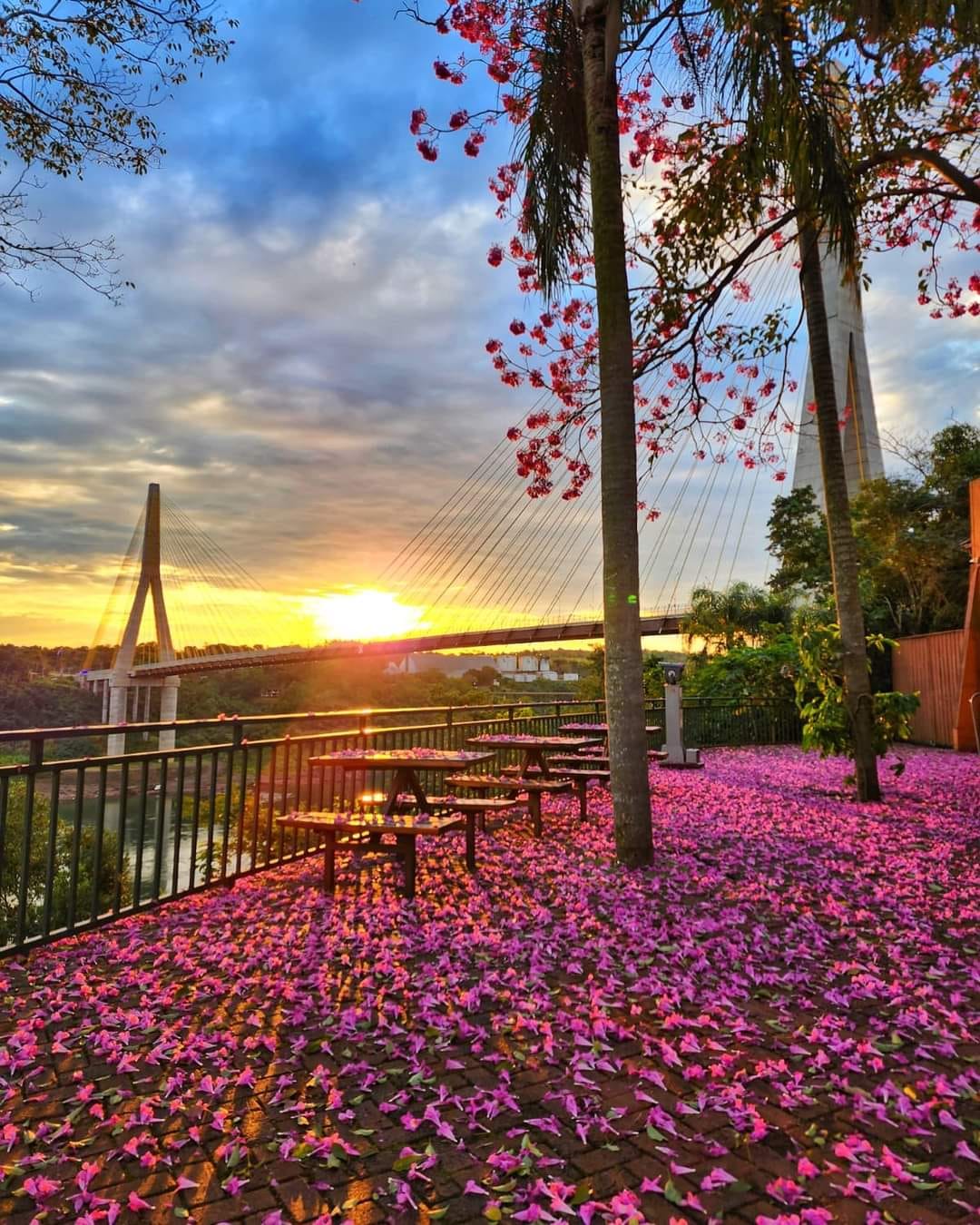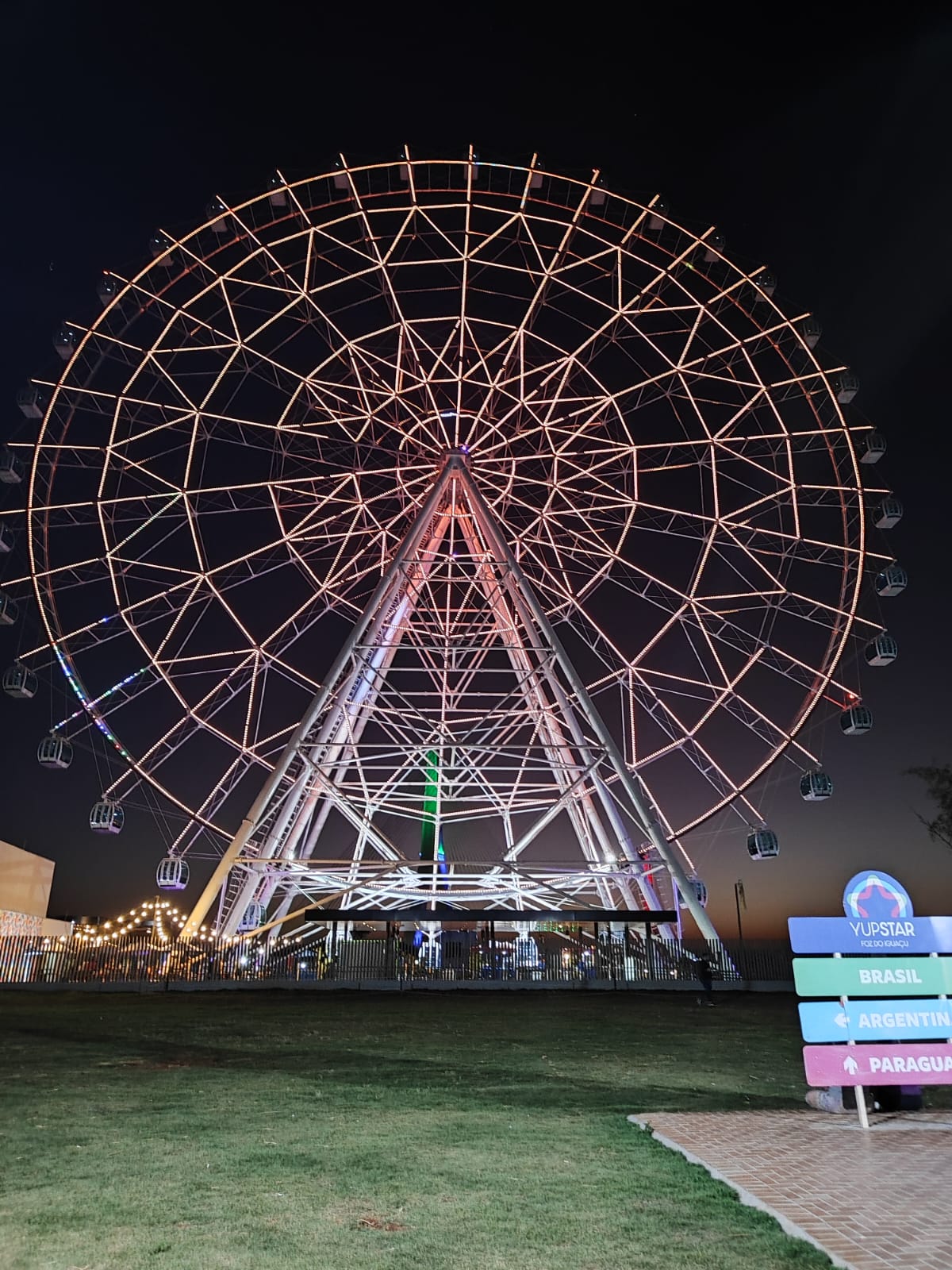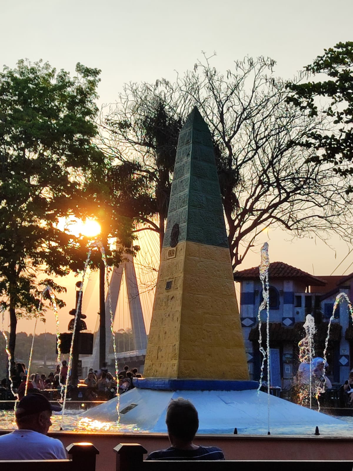 Luzes neon, motos, espetáculos aquáticos e arquitetura ao anoitecer.